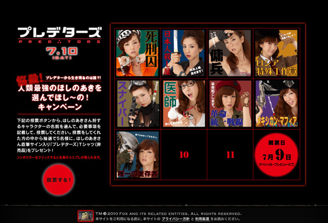 ほしのあきが、映画『プレデターズ』の公開を記念し、本作に登場する殺し屋9人のコスプレに挑戦する「人類最強のほしのあきを選んでほし~の! キャンペーン」を実施… キャンペーンサイトでは、ほしのの悩殺コスプレ姿を公開… ……医者の“ほしのあき”が… ほしのあき/Play H PR |